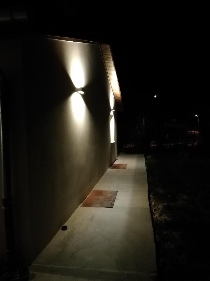 Installation de plusieurs éclairages extérieurs sur la façade d'une maison dans un lotissement de Belleville-en-Beaujolais.